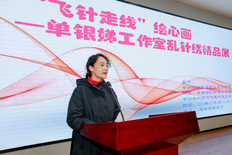 12月2日下午,室外寒意渐渐,室内暖意浓浓,领秀展厅“飞针走线”绘心画---单银娣工作室乱针绣精品展正在举行,参加开幕式的领导和嘉宾有:单银娣工作室负责人、单银娣女儿黄莉,单银娣工作室艺术指导张振宇,常州市非物质文化遗产促进会会长黄欣,中国纺织服装教育学会会长倪阳生,光大银行武进支行行长陆明,南京云开数据科技有限公司焦艾琳,学院党委书记吴访升,党委委员、副院长张文明,党委委员、宣传部长夏斌,党政办主任赵振勇,人事处长侯喜军,教务处长夏冬,科技处、校企合作处长李爱红,团委书记朱鹏,学生处副处长长陆亚波,以及各二级学院院长。开幕式由文化传承与创新中心主任顾明智主持。
