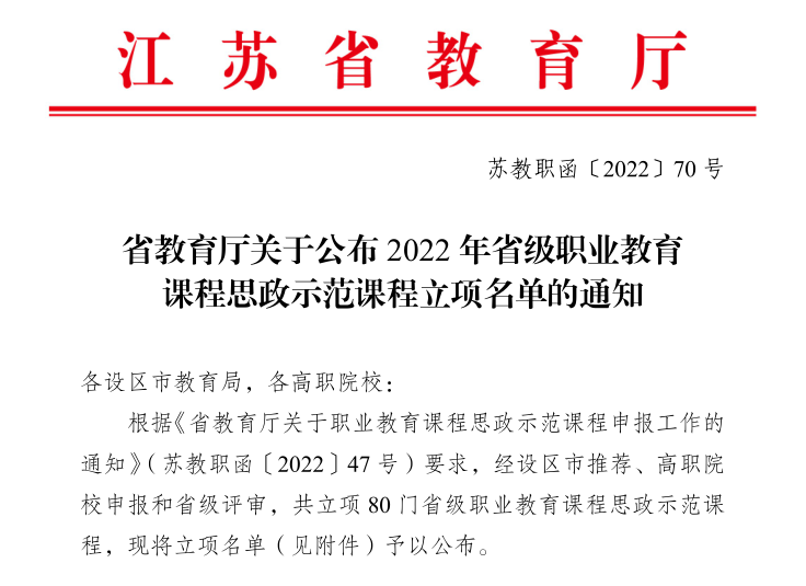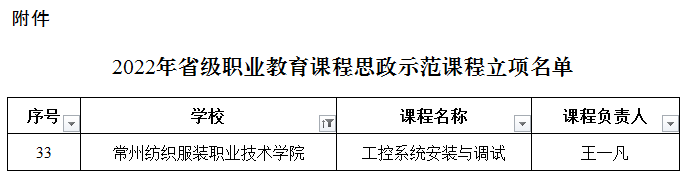课程思政示范课程是深入推进高校课程思政建设、切实提高人才培养质量的重要举措之一。根据《省教育厅关于职业教育课程思政示范课程申报工作的通知》(苏教职函〔2022〕7号),我校王一凡老师负责的《工控系统安装与调试》课程获评省级职业教育课程思政示范课程。